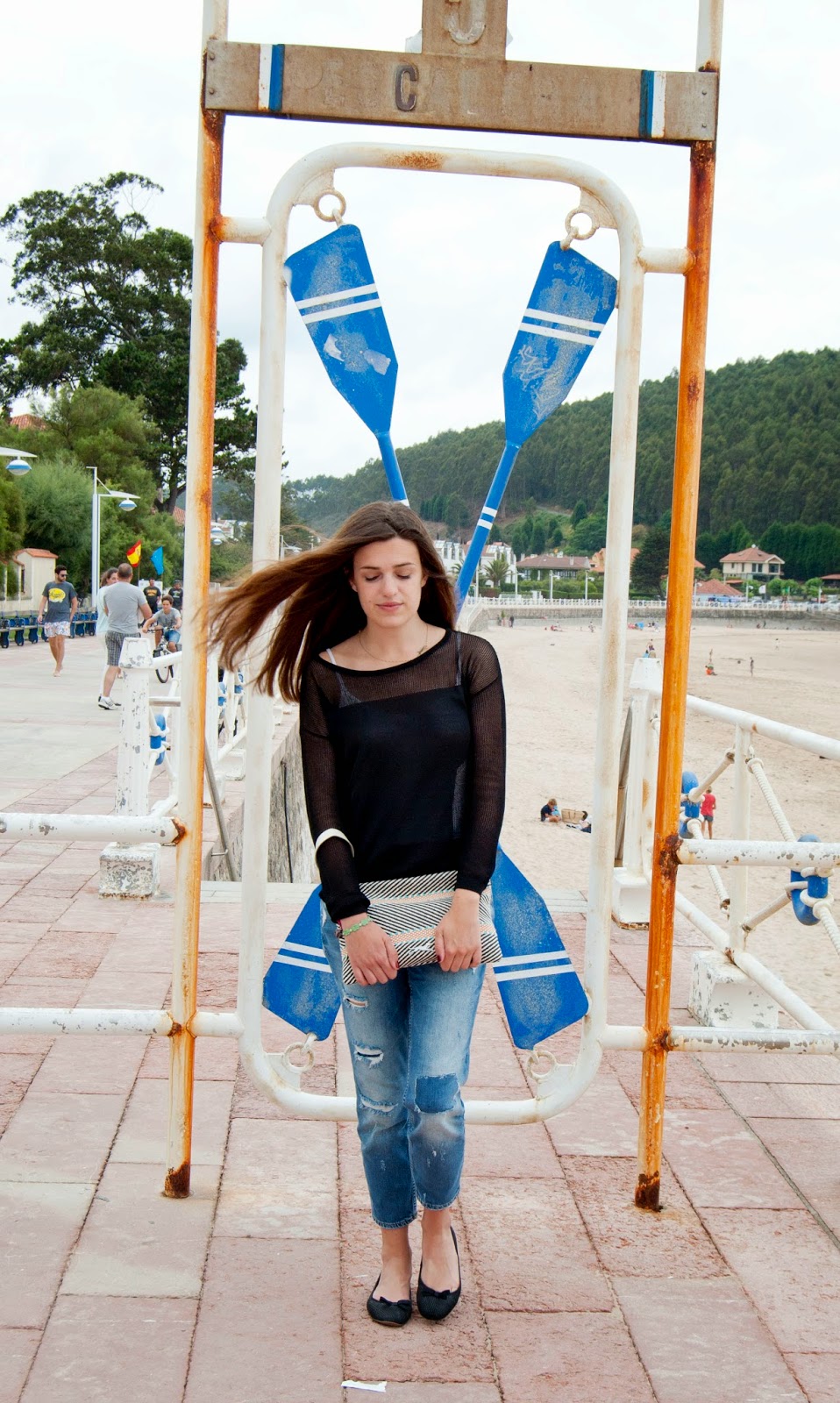 El outfit que elegí para este día es muy casual y cómodo, un pantalón boyfriend, unas bailarinas negras, un jersey negro con partes semitransparentes y, aunque no se vea una crop top en color beige de punto, cómo complemeto un clutch de colores muy veraniegos.